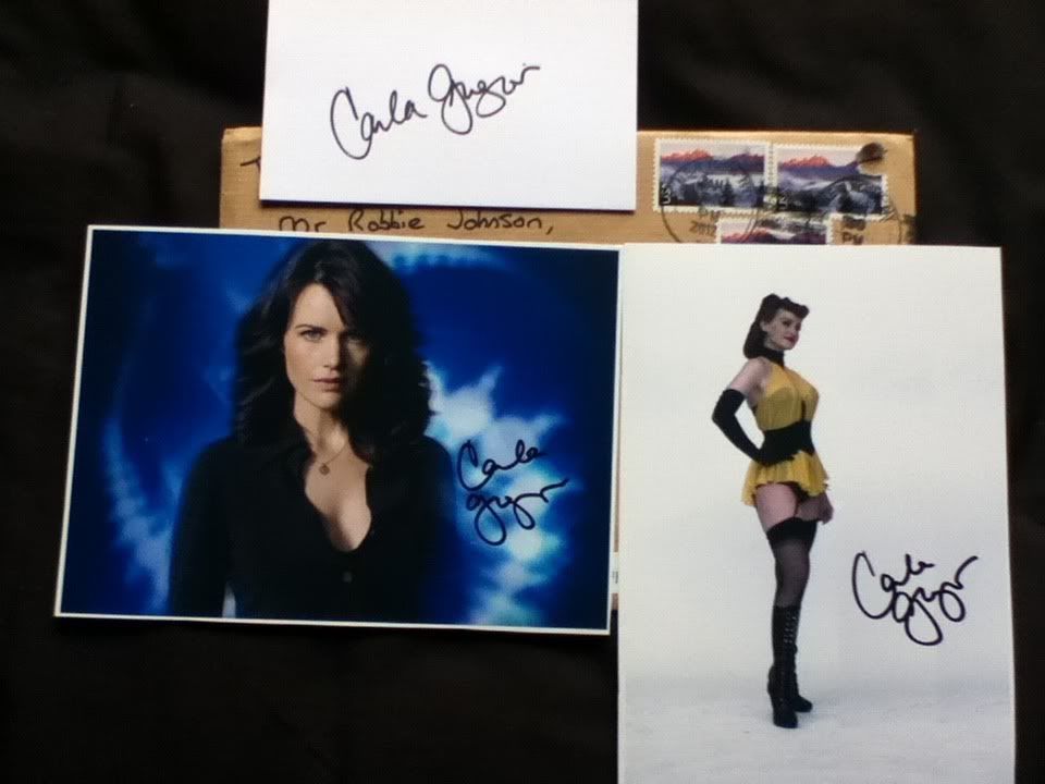 I sent a letter, 2 pics and an index card to Carla Gugino who is on Broadway at the moment. She has been in quite a few movies like Watchmen, Sucker Punch and quite a few TV shows. One of the photos is from Watchmen, while the other is from the TV show Threshold (for myself), which unfortunately only lasted 1 season, which was a shame as I liked it. Anyway, I am very pleased to get the photos and card back so quickly.