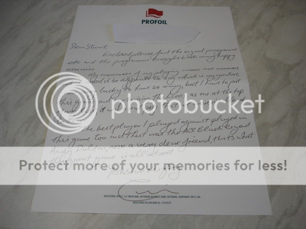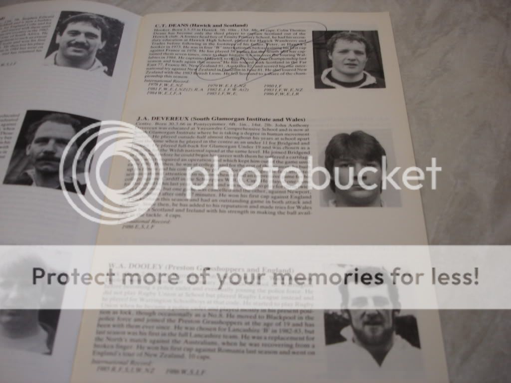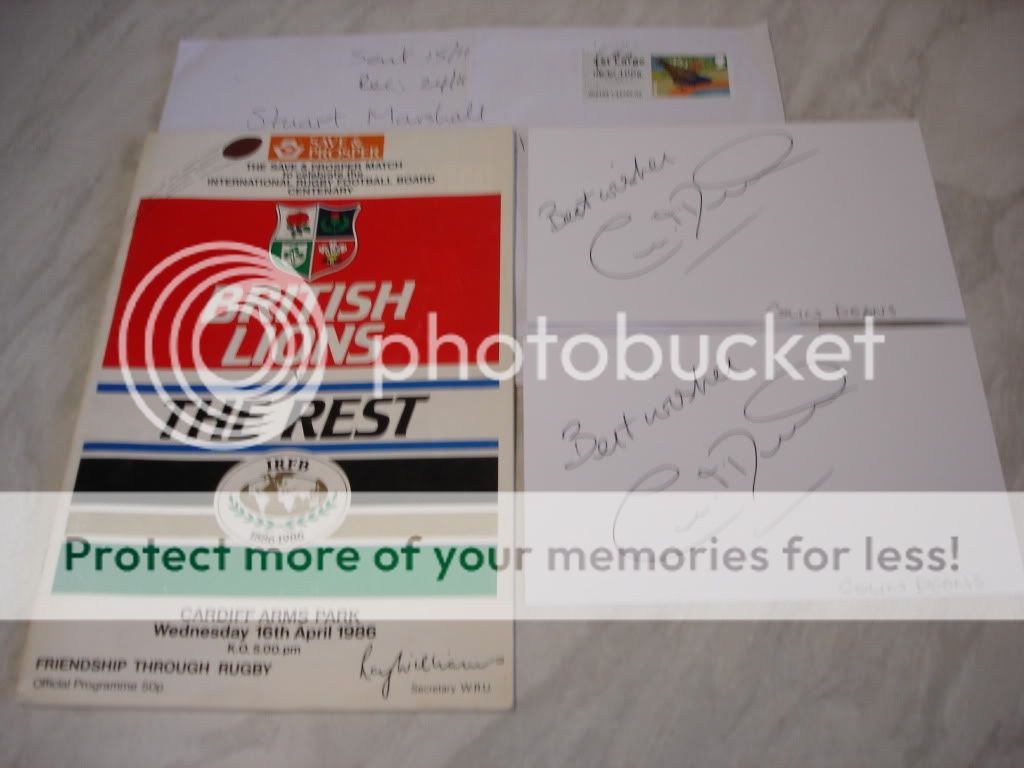 Sent British Lions programme, two pics & two index cards to Colin Deans via Hawick RFC on 15/11 received back on 24/11 all signed.