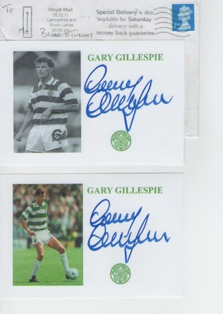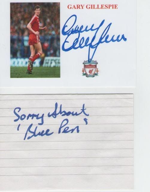 I sent three cards to Gary Gillespie at LCF TV two weeks ago got all three cards back signed today , he signed them in blue pen but he did apologise for it .