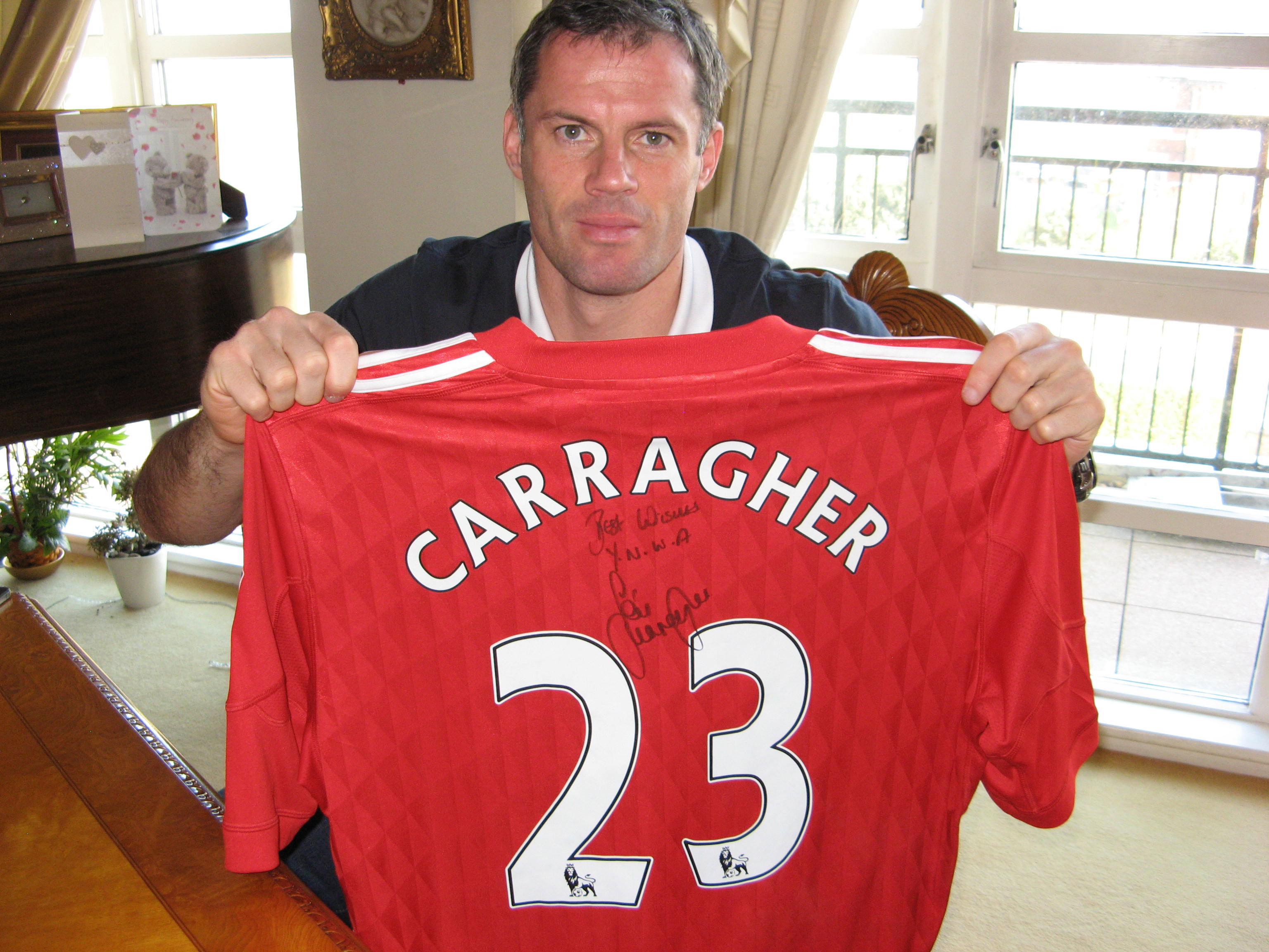 Nothing TTM for me today but I did receive the shirt back that I sent for a private signing with Jamie Carragher. It came with a COA from the 23 Foundation and even a better a great photo emailed to me of Jamie with the shirt: