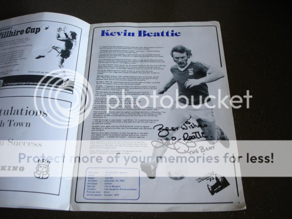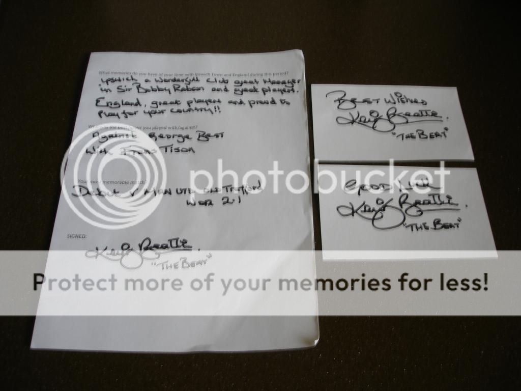 Sent my multi-signed England shirt, 1978 Ipswich FA Cup brochure, questionaire and index cards to Kevin "The Beat" Beattie on 24/4 and received all back signed yesterday, 17/5.