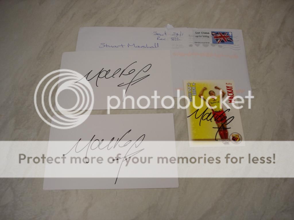 Sent footie card and index cards to Malky Mackey on 24/1 and received all back signed today, 8/2.