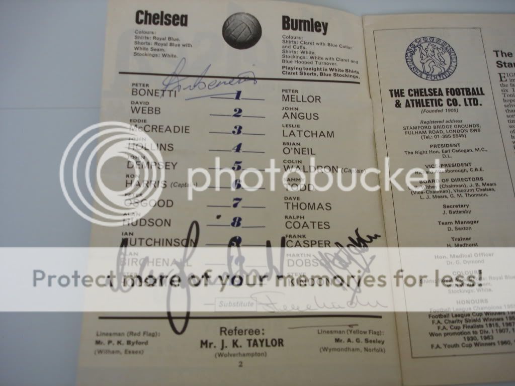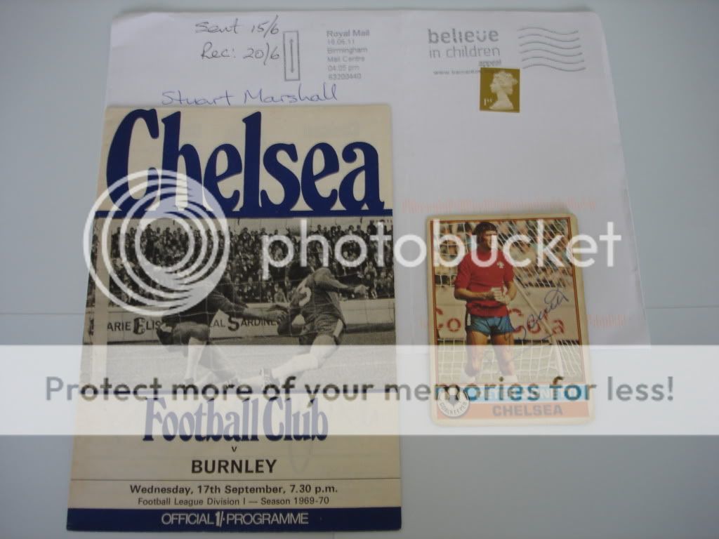 Sent football card and Chelsea/Burnley 1969 programme to Peter Bonetti on 15/6 received both back signed today 20/6.
