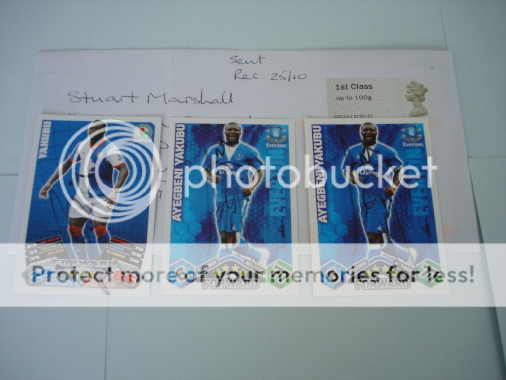 Sent three Match Attax cards to Yakubu on 19/10 and received all back signed today, 25/10. He used a black felt pen which looks like it is on the way out!
