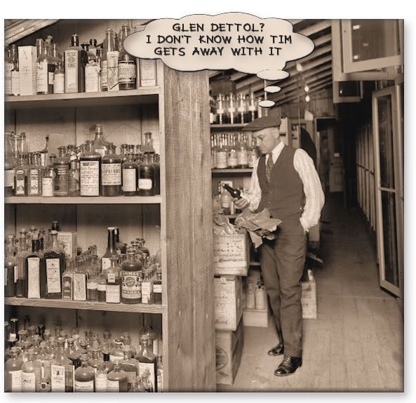 Meanwhile . . . . . . Tim's butler begins ta question his boss's taste in whursky . . .